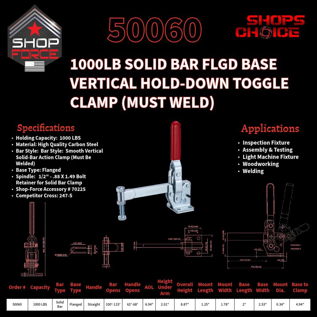 1000LB SOLID BAR FLGD BASE VERTICAL HOLD-DOWN TOGGLE CLAMP (MUST WELD) Shop’sChoice™