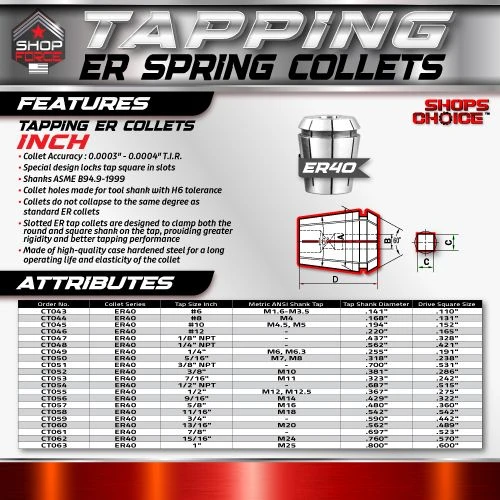 • SPECIAL DESIGN: Note that these collets do not ” COLLAPSE” to the same degree as standard ER Collets. Our SLOTTED Design is for maximum clamping on the entire Tap. Shop’s Choice